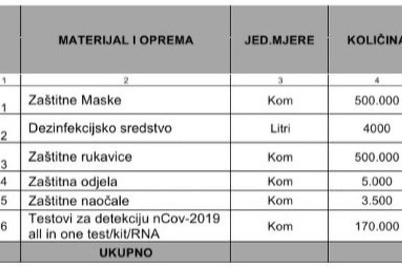 Također, osim toga planirana je nabavka 4.000 litara dezinfekcijskih sredstava, 5.000 zaštitnih odijela i 3.500 zaštitnih naočala. Ukupna vrijednost testova i opreme iznosi 7.128.012 KM.