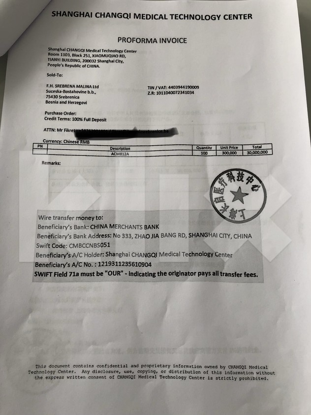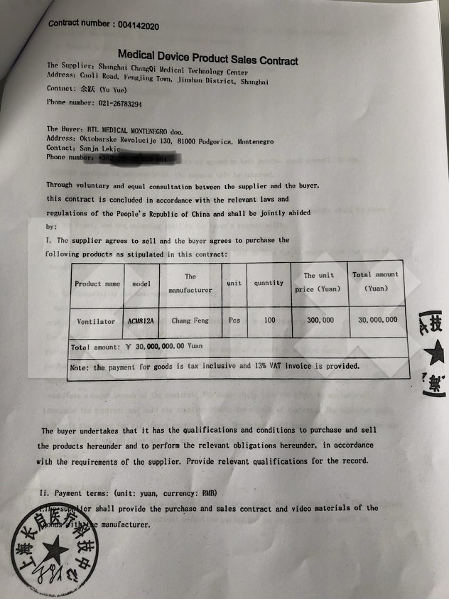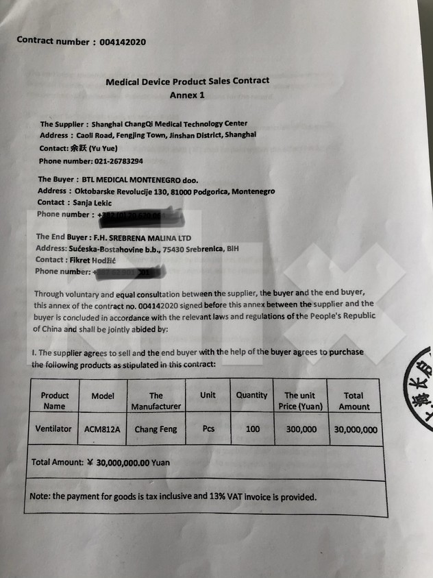 “BTL Medical Montenegro” je privatna firma iz Podgorice koja se bavi trgovinom medicinske opreme. Oni 14. aprila sklapaju ugovor sa prodavcem 100 respiratora iz Kine, firmom “Shangai ChangQi Medical Tehnology Center”. U ugovoru je navedeno da kupuju 100 respiratora model ACM812A, proizvođača Chang Feng. Cijena je 30 miliona kineskih juana, odnosno 3,9 miliona eura (7,6 miliona KM). Podsjetimo da Federacija za kupovinu izdvojila 10,5 miliona KM, što je otprilike oko 5,36 miliona eura.
