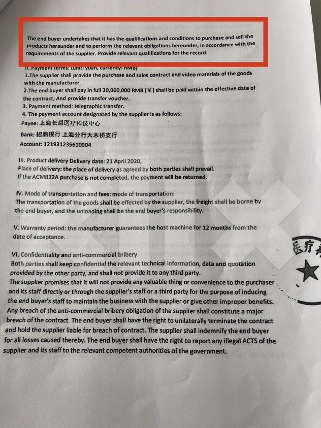 Prvi ugovor je potpisan 28. marta za nabavku 200 respiratora model ACM812A, ukupne vrednosti 5 miliona eura, a drugi o nabavci 200 respiratora marke Shangrila 510S od 29. marta, ukupne vrednosti 3,9 miliona eura.