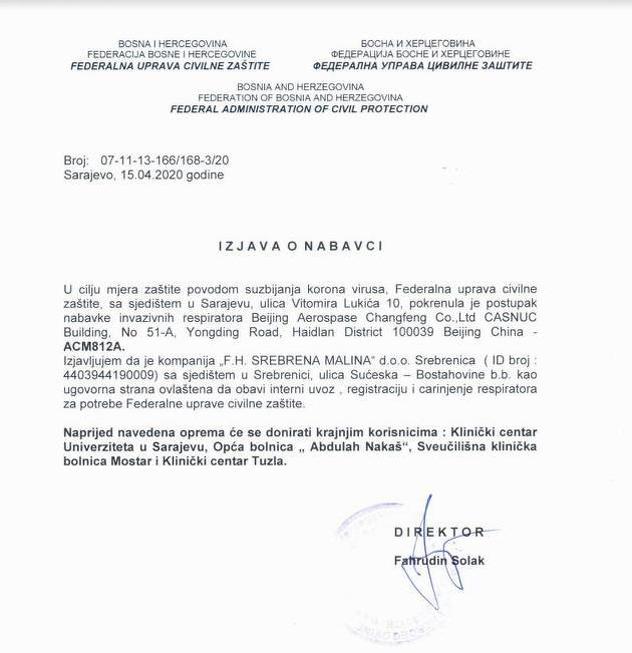 Da li je “Srebrena malina” imala kvalifikacije za kupovinu respiratora kako se navodi u ugovoru? Ranije objavljeni dokumenti ostavljaju sumnju da nije imala. Prvo ovaj navedeni aneks ugovora je potpisan 14. aprila. Postavlja se pitanje kako je onda “Srebrena malina” mogla potpisati ugovor o nabavci respiratora 14. aprila, ako je direktor FUCZ-a Fahrudin Solak tek sutradan, 15. aprila potpisao izjavu o nabavci respiratora kojom obavještava Agenciju za lijekove BiH da je kompanija “Srebrena malina” ovlaštena da obavi uvoz, carinjenje i registraciju respiratora.