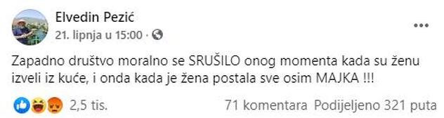 Islamski tumač Elvedin Pezić, kojeg na Facebooku prate 222 hiljade osoba, nedavnim statusom o ulozi žena u društvu podigao je mnogo prašine. Ipak, njegov stav je podržalo više od dvije i po hiljade pratitelja.
