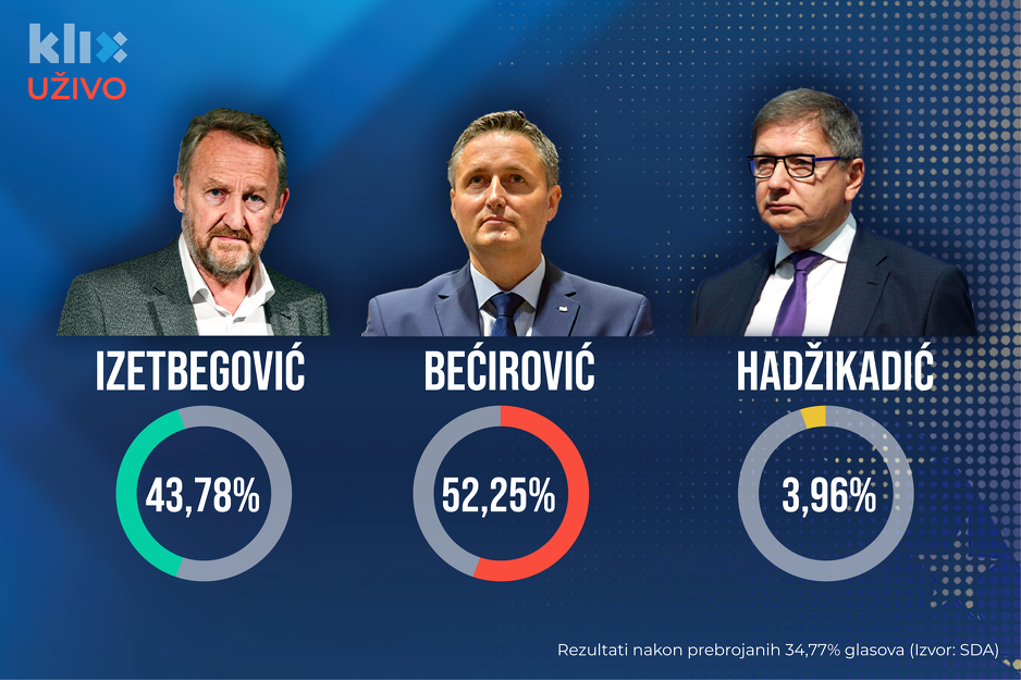 Zajednički kandidat 11 stranaka nakon 34,77 posto prebrojanih glasova ima 52,25 posto glasova ili 98.647 glasova. Bakir Izetbegović ima 82.651 glas ili 43,78 posto, dok Mirsad Hadžikadić ima 3,96 posto ili 7.483 glasova.