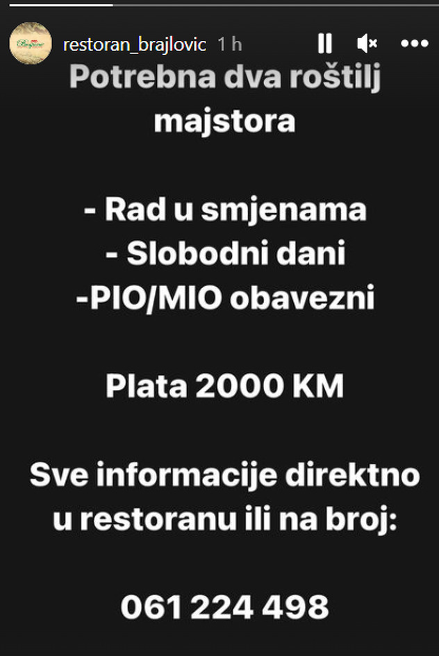 “Potrebna dva roštilj majstora. Rad u smjenama, slobodni dani. PIO/MIO obavezni. Plata 2.000 KM, objavili su na Instagram storyju.