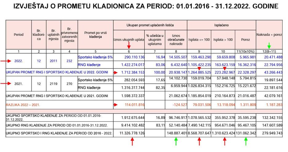 Dakle građani su u 2022. godini u kladionicama potrošili 114.011.816 KM više u odnosu na 2021., a Federacija BiH zaradila 1.187.283 KM više.