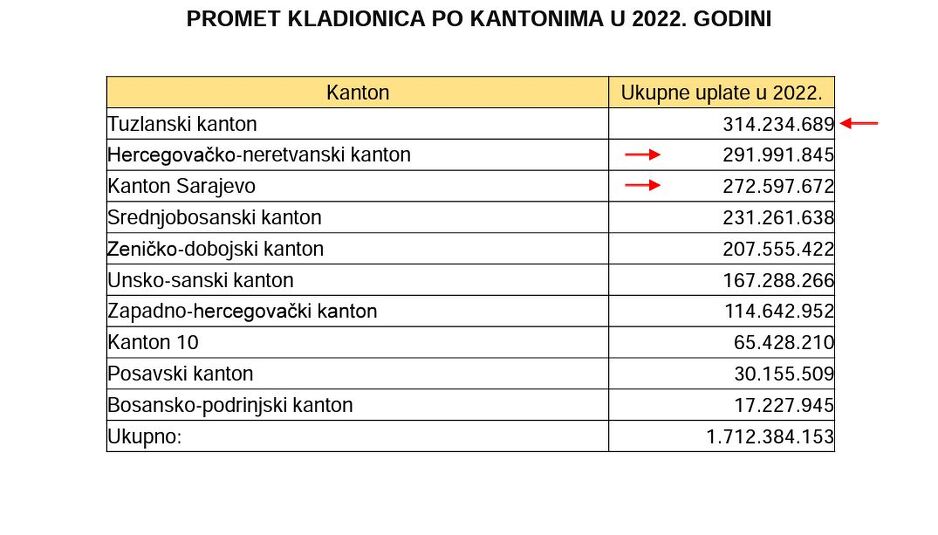 Najviše uplata u 2022. je bilo u Tuzlanskom kantonu, tačno 314.234.689 KM, a najmanje u Bosanskopodrinjskom kantonu, svega 17.227.945. Sarajlije su u kladionicama prošle godine ostavili 272.597.672 KM.