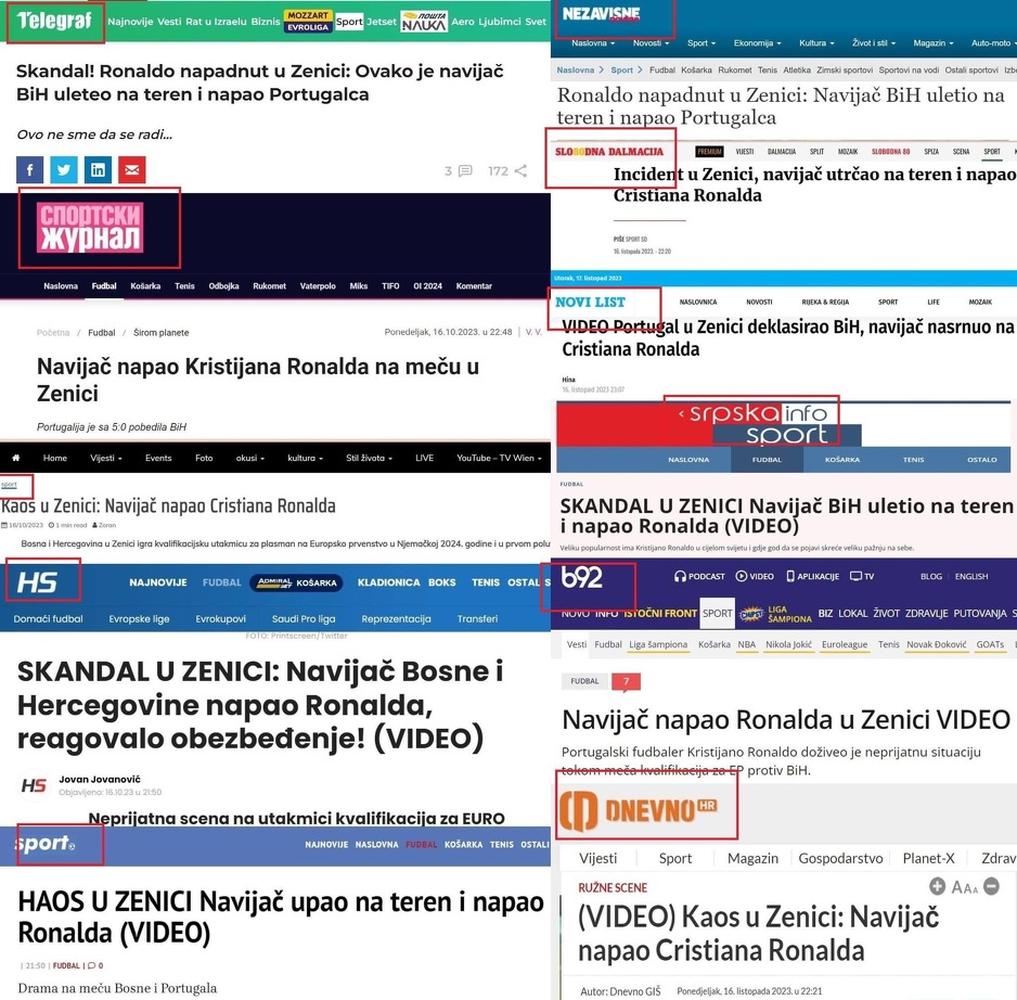 “Skandal! Ronaldo napadnut u Zenici: Ovako je navijač BiH uletio na teren i napao Portugalca”, “Haos u Zenici: Navijač upao na teren i napao Ronalda”, samo su neki od senzacionalističkih naslova kojima se pokušao preuveličati događaj koji se desio na Bilinom polju, a koji su objavili Telegraf, Sportski Žurnal, B92, Slobodna Dalmacija, Dnevno.hr, Novi list…
