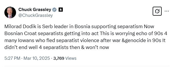 “Lider bosanskih Srba Milorad Dodik podržava separatizam u Bosni i Hercegovini. Sada su i separatisti među bosanskim Hrvatima krenuli u akciju. To je zabrinjavajući odjek devedesetih za mnoge koji su pobjegli od nasilja i genocida u tom periodu. Separatizam tada nije završio dobro, a neće ni sada”, poručio je Grassley.