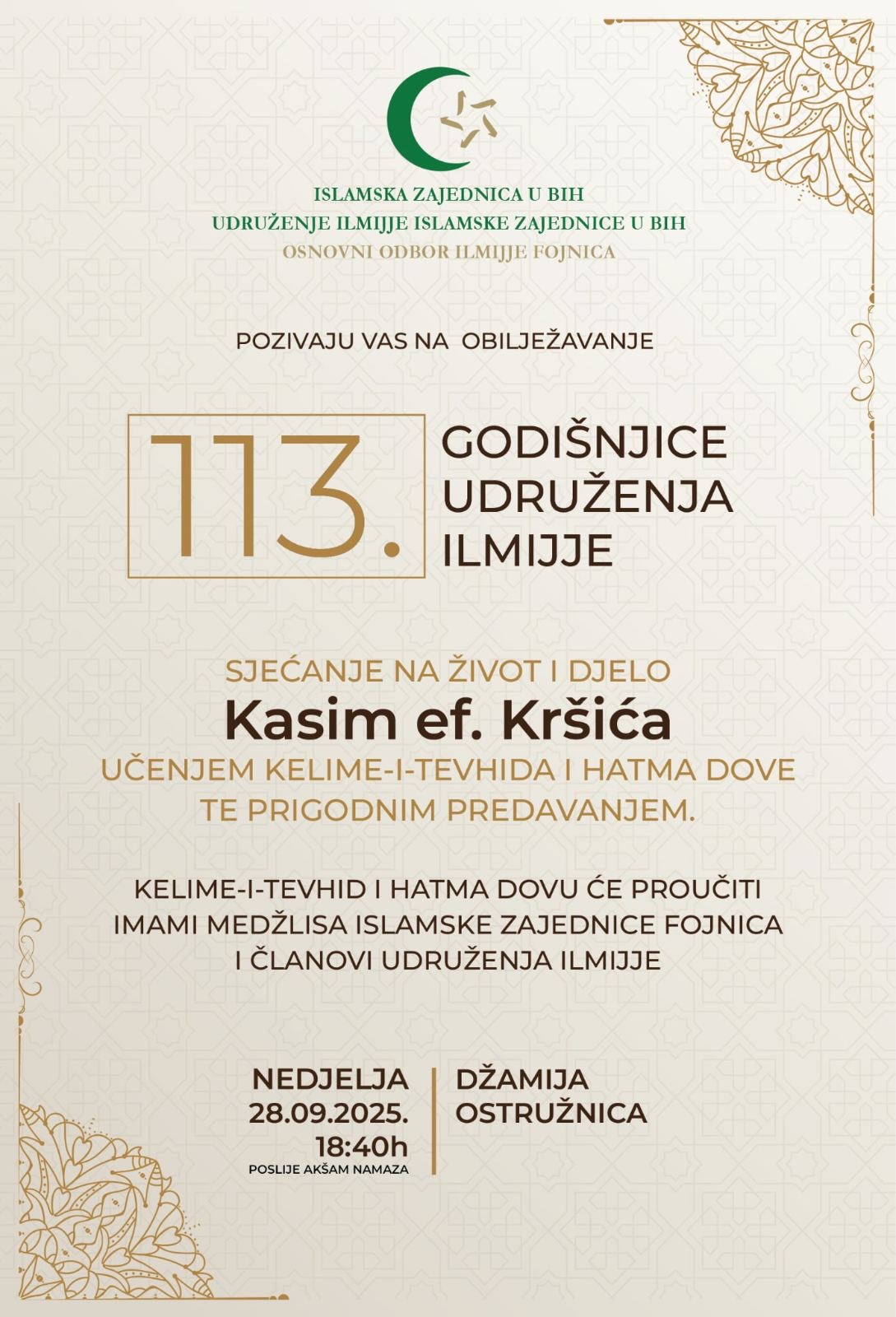 Večeras, u nedjelju 28. septembra 2025. godine, u džamiji u Ostružnici biće upriličeno obilježavanje 113. godišnjice Udruženja ilmijje Islamske zajednice u Bosni i Hercegovini. Program počinje u 18:40 sati, poslije akšam-namaza, a organizator je Osnovni odbor ilmijje Fojnica.