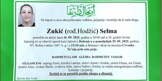 Tuga, nevjerica i šok zavladali su u Tuzlanskom kantonu i šire, nakon vijesti da je, u 36. godini života, nakon teške borbe s bolešću, na ahiret preselila Selma Zukić.