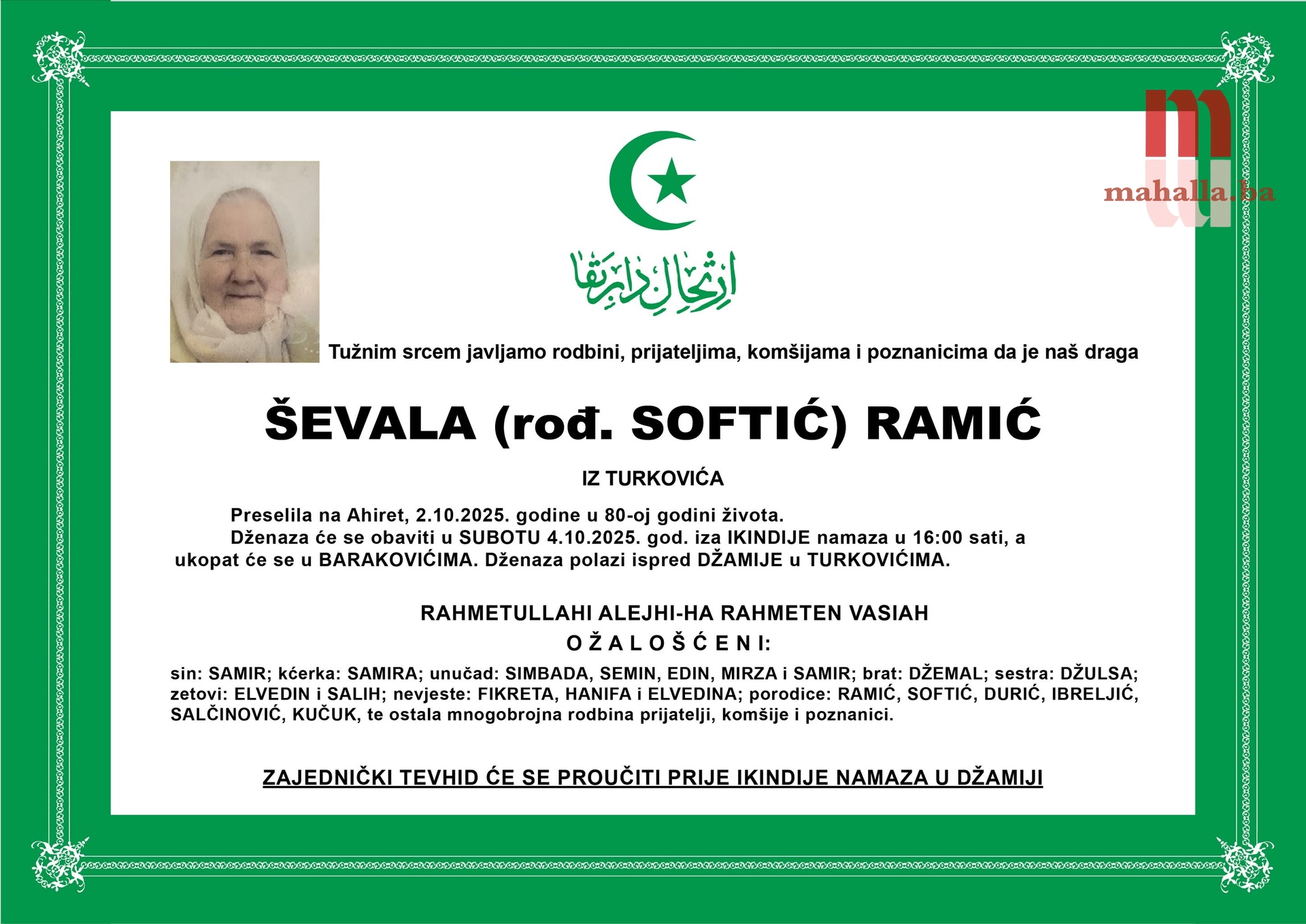 Na Bolji svijet je preselila ŠEVALA (rođ. SOFTIĆ) RAMIĆ iz Turkovića.