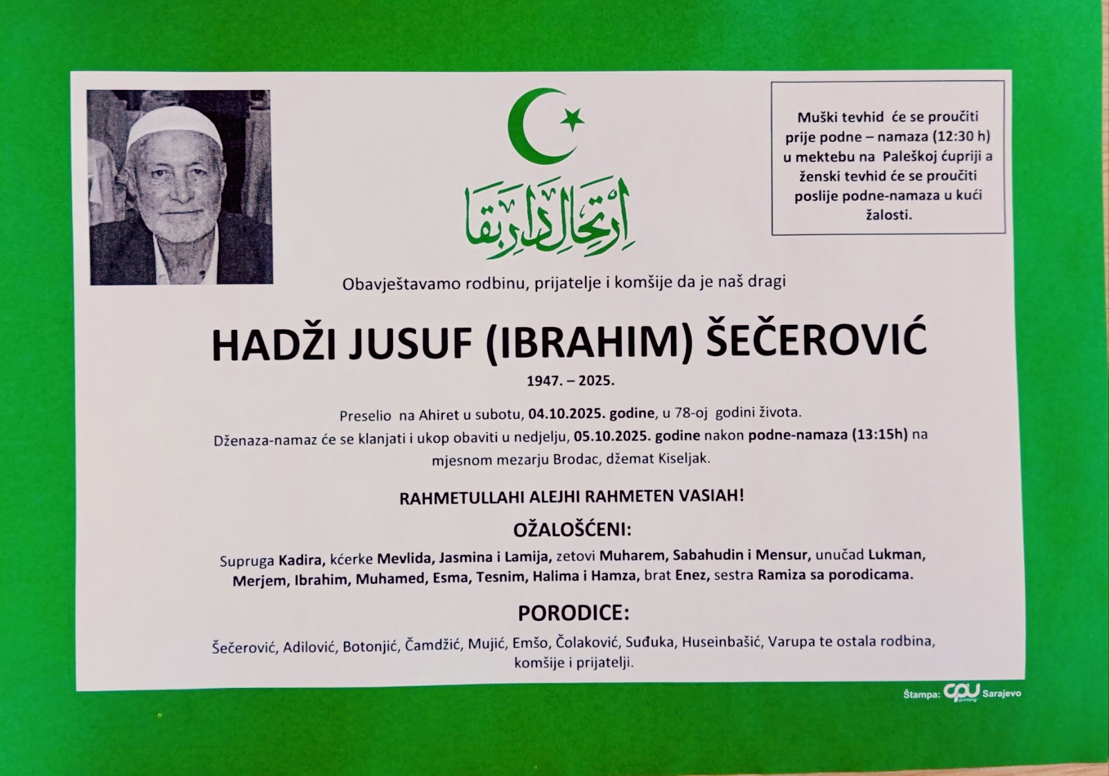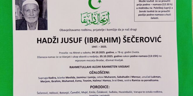 Dženaza-namaz će se klanjati i ukop obaviti u nedjelju, 05.10.2025. godine, nakon podne-namaza (13:15h) na mjesnom mezarju Brodac, džemat Kiseljak.