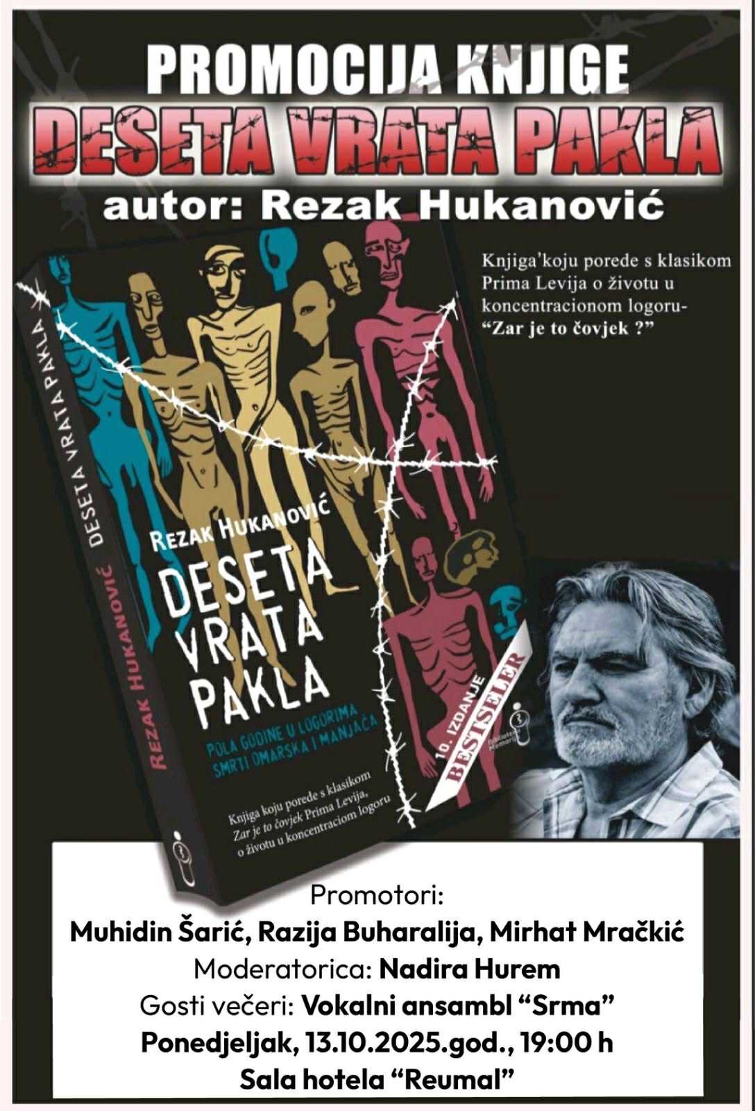 U ponedjeljak, 13. oktobra 2025. godine, u sali hotela “Reumal” u Fojnici bit će održana promocija knjige “Deseta vrata pakla” autora Rezaka Hukanovića. Ova potresna i snažna knjiga donosi autentično svjedočanstvo autora o mjesecima provedenim u zloglasnim logorima Omarska i Manjača, te je s pravom svrstana među najvažnija djela o logoraškom iskustvu tokom rata u Bosni i Hercegovini.