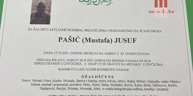 Dženaza-namaz će se klanjati i ukop obaviti u subotu, 18. oktobra 2025. godine, iza ikindije-namaza (15:30 sati).