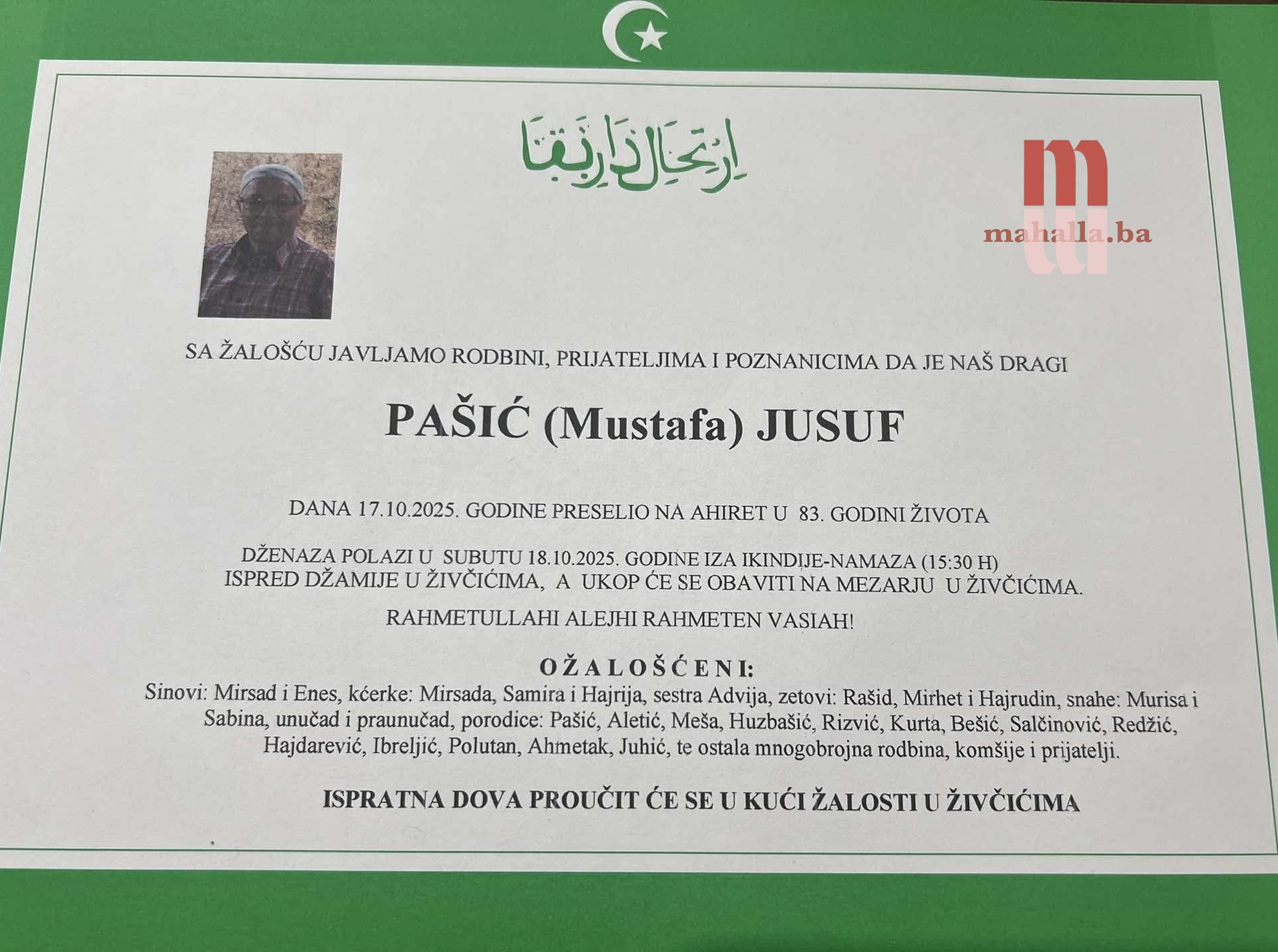 Na Bolji svijet je preselio PAŠIĆ (Mustafa) JUSUF iz Živčića.