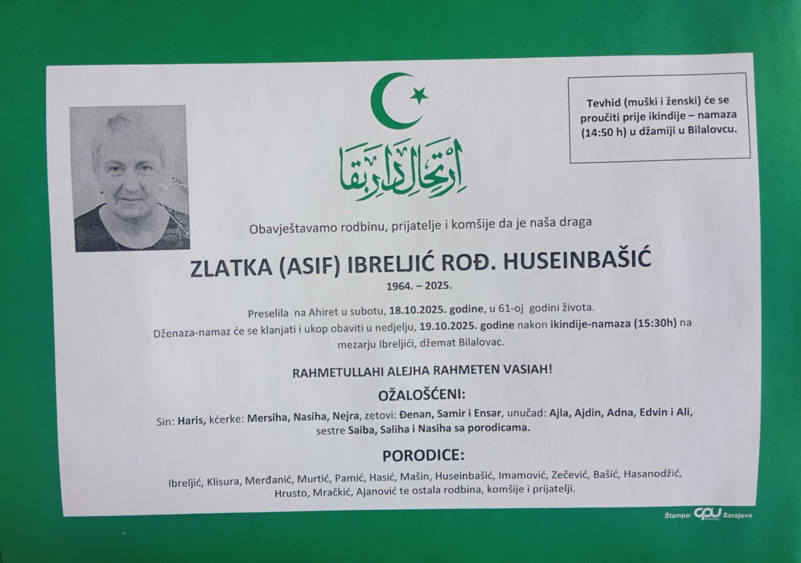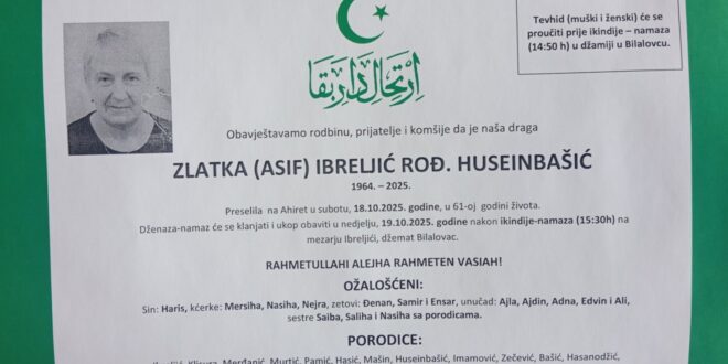 Dženaza-namaz će se klanjati i ukop obaviti u nedjelju, 19. 10. 2025. godine, nakon ikindije-namaza (15:30 sati) na mezarju Ibreljići, džemat Bilalovac.