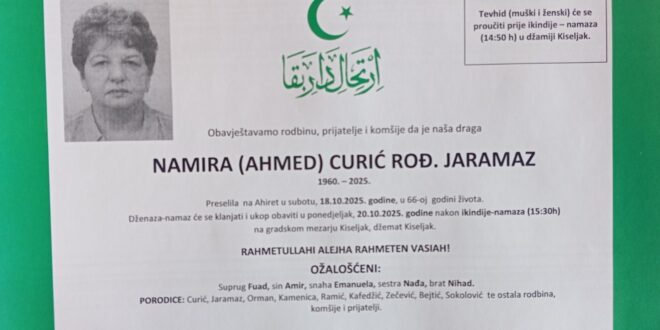 Dženaza-namaz će se klanjati i ukop obaviti u ponedjeljak, 20.10.2025. godine, nakon ikindije-namaza (15:30 h) na Gradskom mezarju Kiseljak, džemat Kiseljak.
