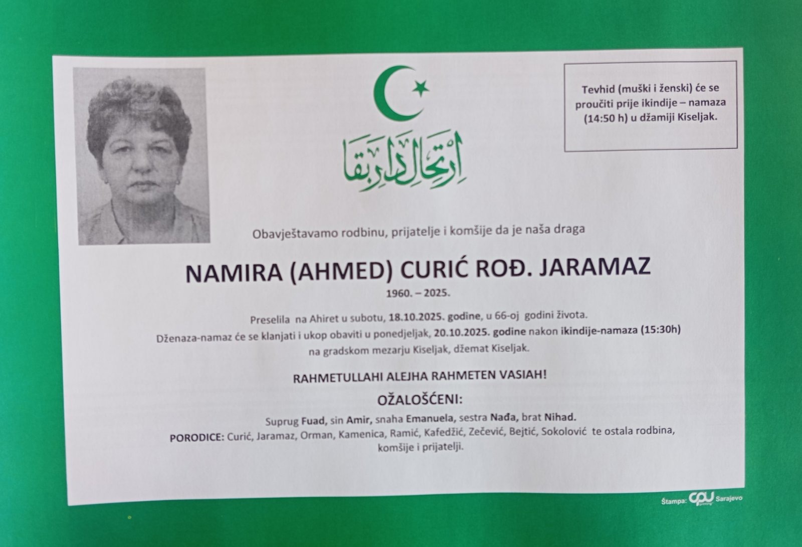 Na Bolji svijet je preselila NAMIRA (AHMED) CURIĆ rođ. JARAMAZ iz Kiseljaka.