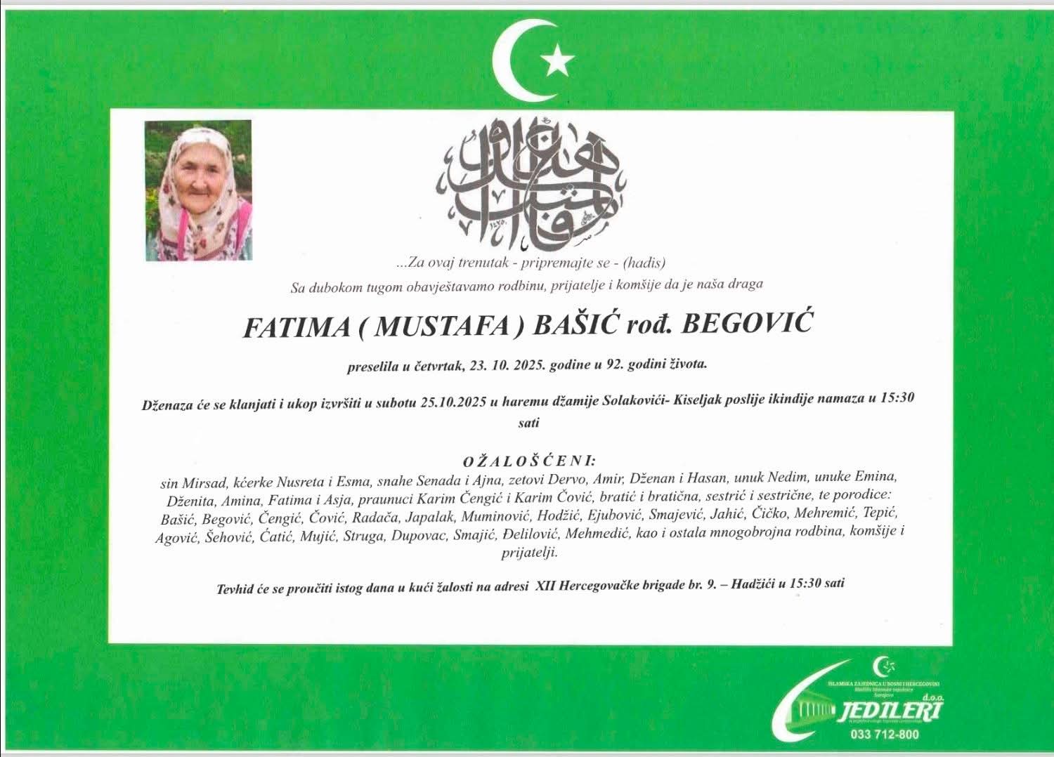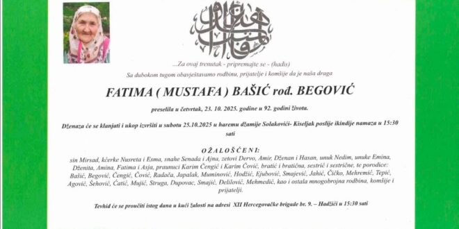 Na Bolji svijet je preselila FATIMA (MUSTAFA) BAŠIĆ rođ. BEGOVIĆ iz Kiseljaka.