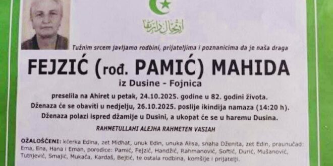 Na Bolji svijet je preselila FEJZIĆ (rođ. PAMIĆ) MAHIDA iz Dusine – Fojnica.