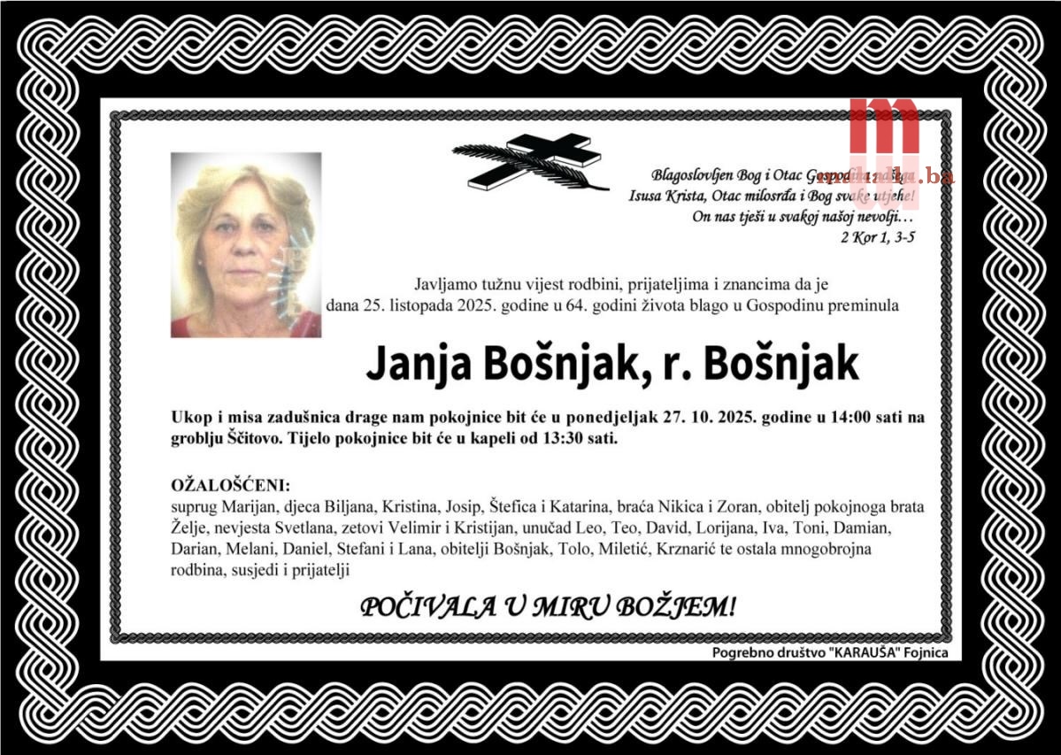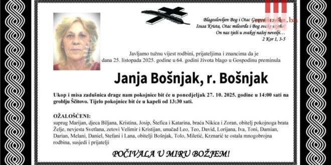 Preminula je JANJA BOŠNJAK, rođ. Bošnjak iz Fojnice u 64. godini života.