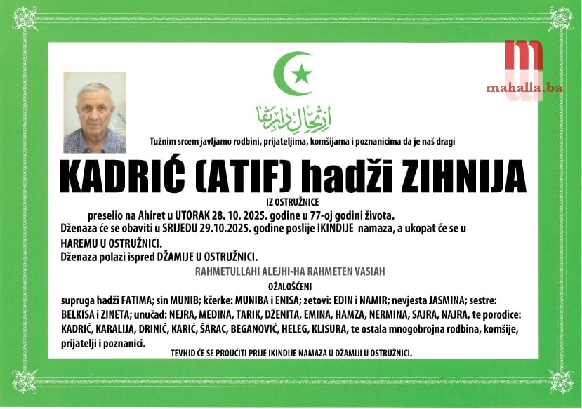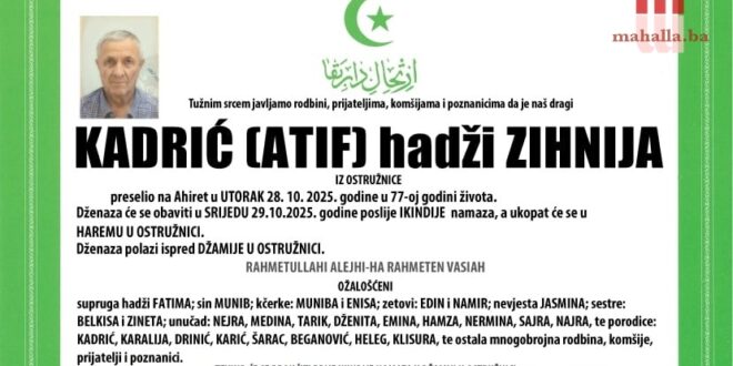 Na Bolji svijet je preselio KADRIĆ (ATIF) HADŽI ZIHNIJA iz Ostružnice.