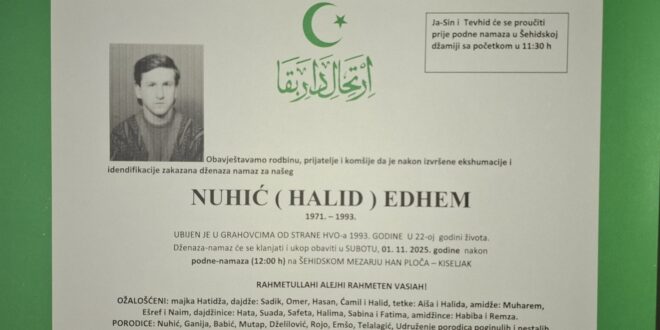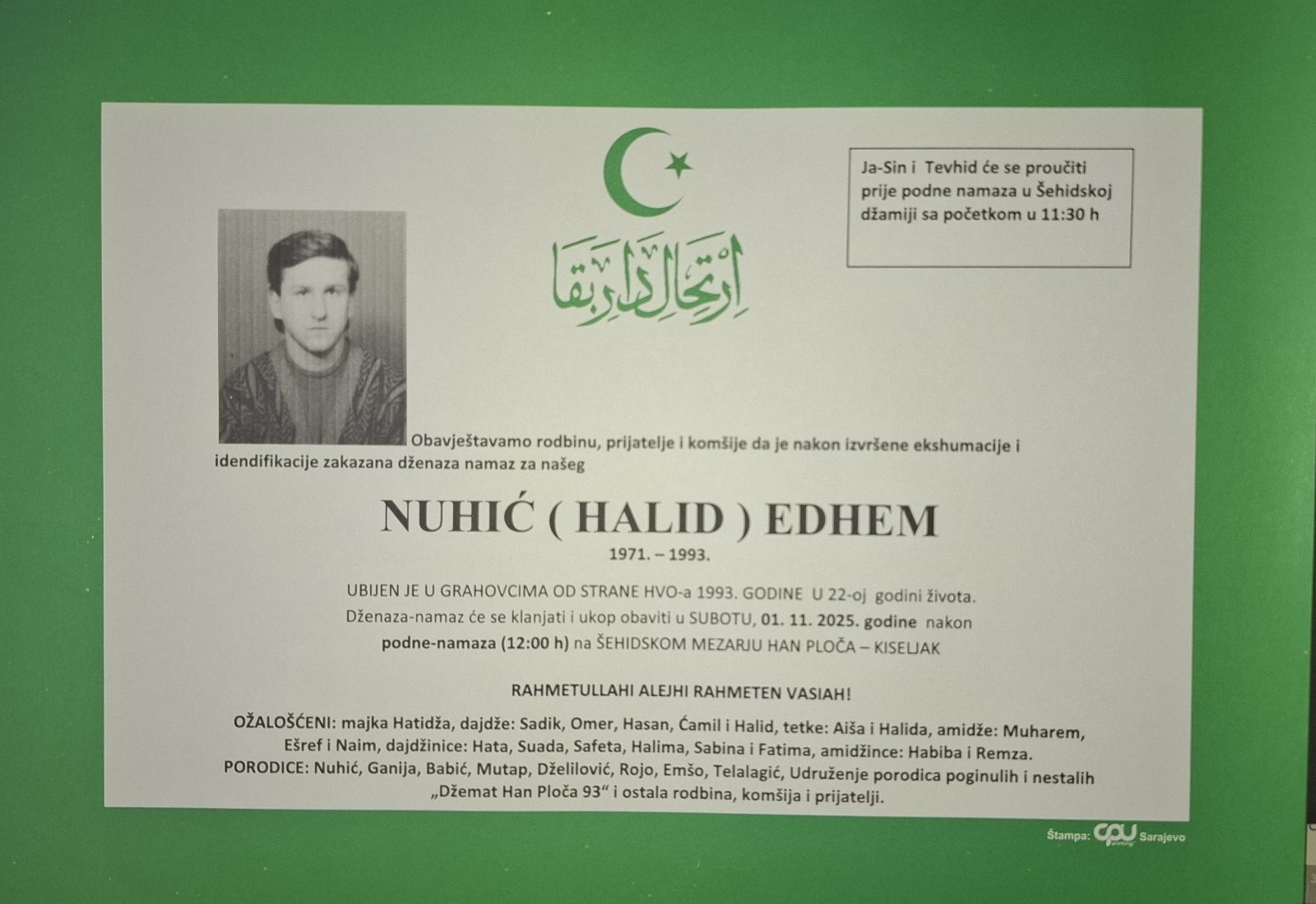 U subotu, 01. novembra 2025. godine, bit će klanjana dženaza-namaz i obavljen ukop šehida Edhema Nuhića, sina Halida, koji je ubijen 1993. godine u Grahovcima od strane pripadnika HVO-a, u 22. godini života.