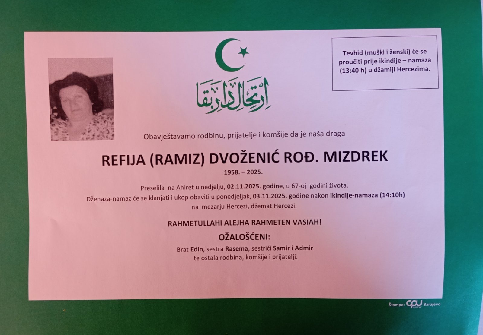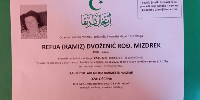 Dženaza-namaz će se klanjati i ukop obaviti u ponedjeljak, 3. novembra 2025. godine,
