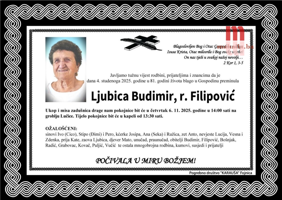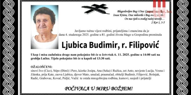 Preminula je LJUBICA BUDIMIR rođ. FILIPOVIĆ iz Fojnice.