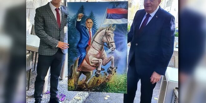 Na fotografiji sa događaja vidi se Dodik kako drži sliku zajedno s autorom, dok je platno prikazano u punoj veličini. Umjetnik je lidera SNSD-a naslikao u plavom odijelu, na bijelom konju u pokretu, u sceni koja podsjeća na neke poznate epske kompozicije.