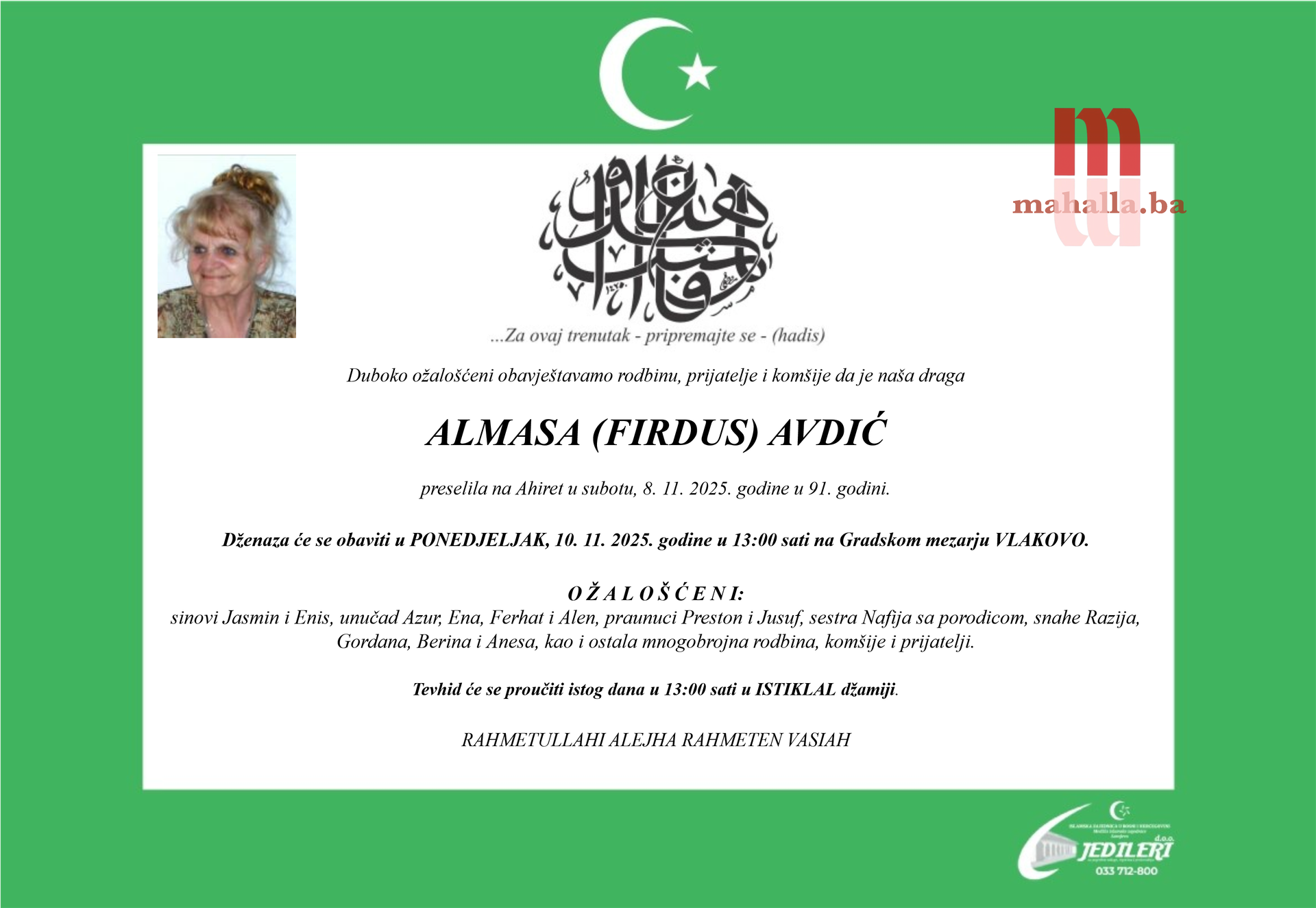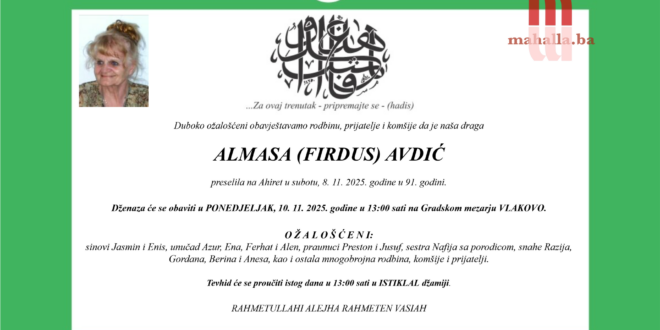 Dženaza će se obaviti u PONEDJELJAK, 10. 11. 2025. godine u 13:00 sati na Gradskom mezarju VLAKOVO.