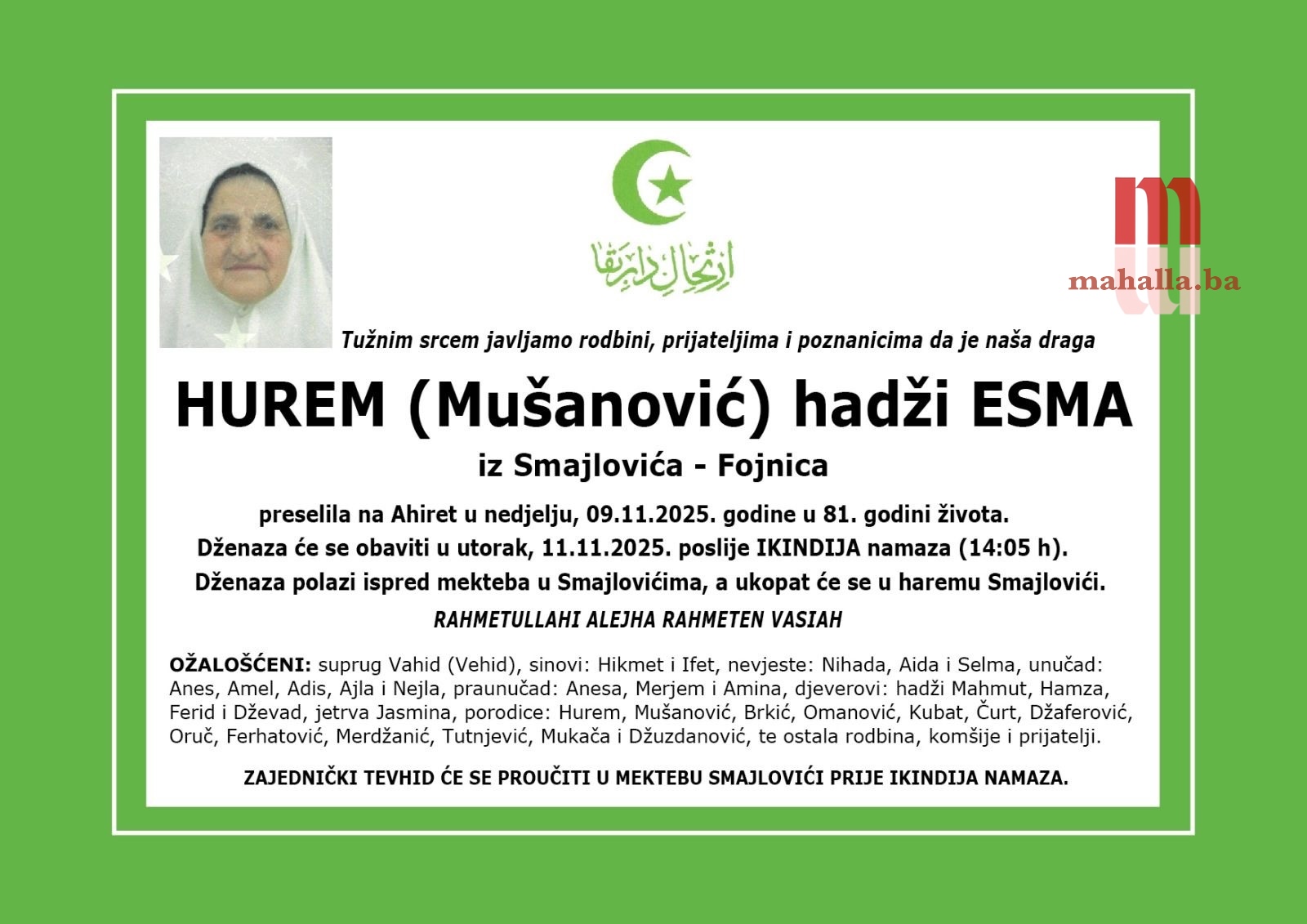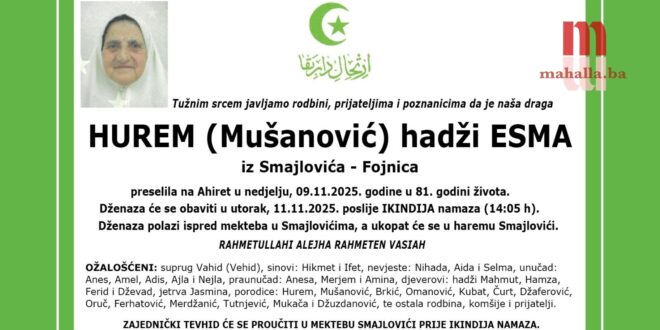 Dženaza-namaz će se obaviti u utorak, 11.11.2025. godine, poslije ikindija-namaza (14:05 h).