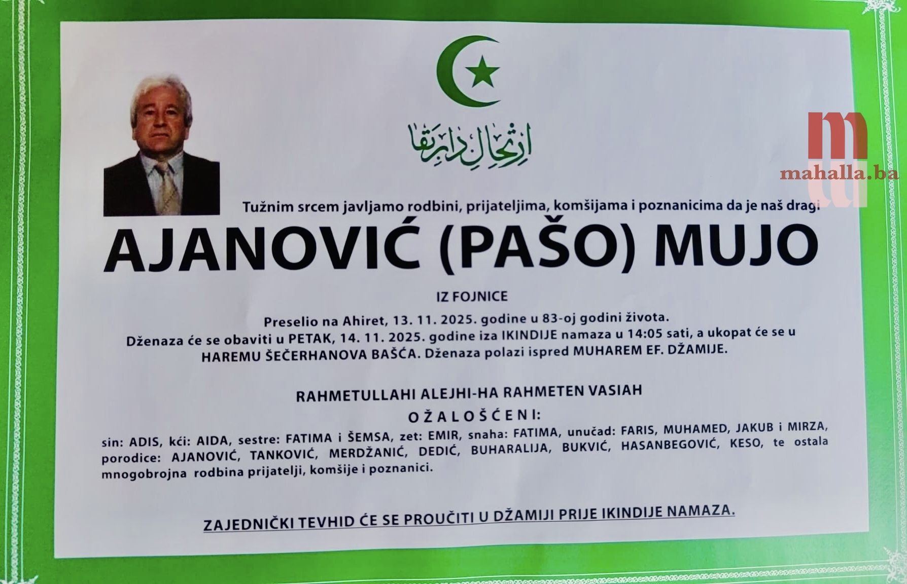 Dženaza-namaz će se obaviti u petak, 14.11.2025. godine, iza ikindije-namaza, u 14:05 sati, a ukopat će se u haremu Šećerhanova bašča.