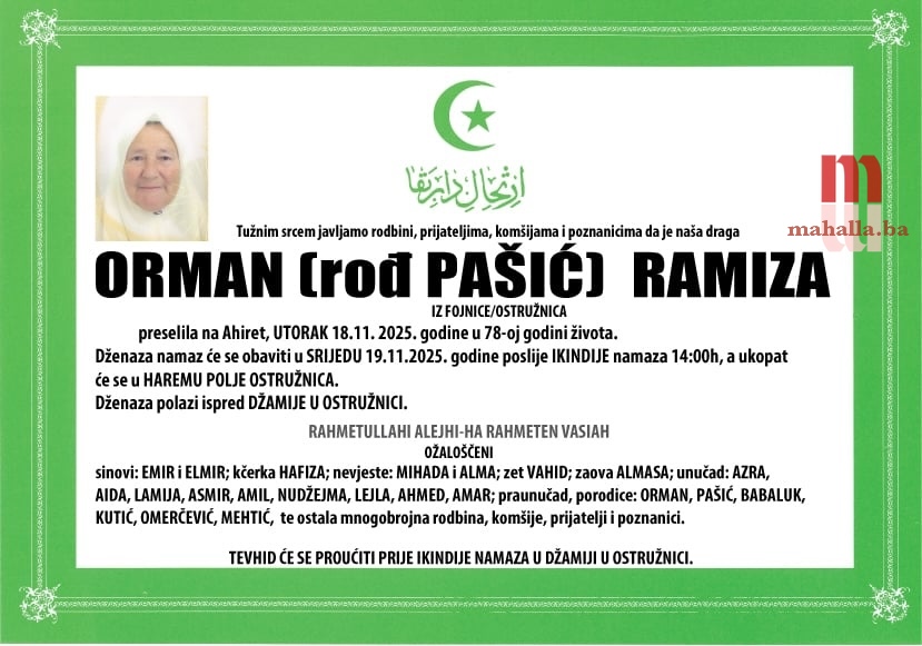 Na Bolji svijet je preselila ORMAN (rođ. PAŠIĆ) RAMIZA iz Fojnice/Ostružnice.