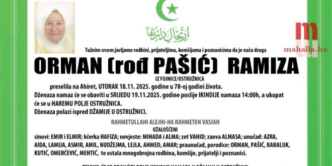 Na Bolji svijet je preselila ORMAN (rođ. PAŠIĆ) RAMIZA iz Fojnice/Ostružnice.