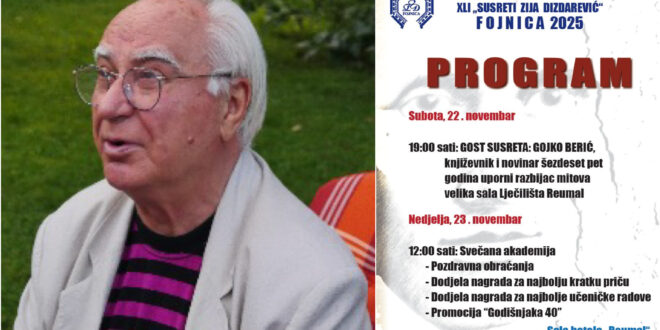 Fojnica će 22. i 23. novembra 2025. godine biti domaćin 41. književno-kulturnih Susreta “Zija Dizdarević”, manifestacije koja čuva uspomenu na jednog od najznačajnijih bh. književnika i promoviše savremeno književno stvaralaštvo.