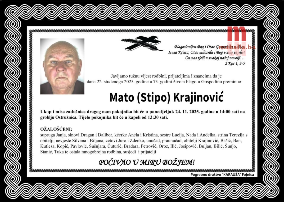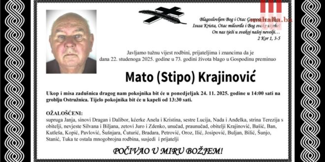 Preminuo je MATO (STIPO) KRAJINOVIĆ iz Ostružnice u 73. godini života.