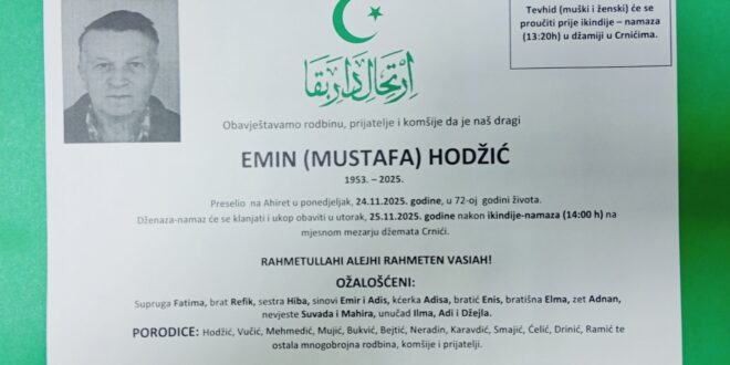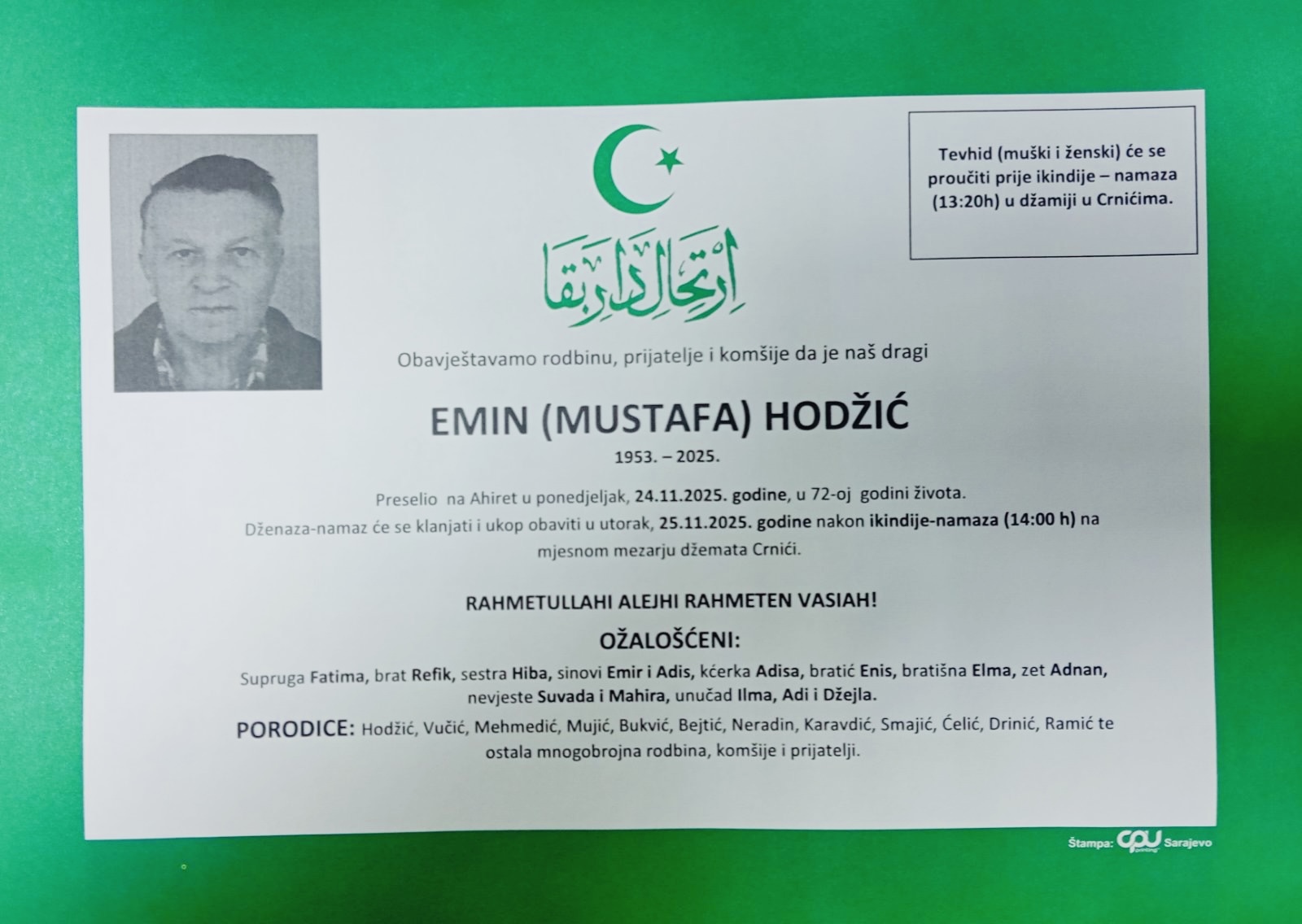 Dženaza-namaz će se klanjati i ukop obaviti u utorak, 25.11.2025. godine, nakon ikindije-namaza (14:00 h) na mjesnom mezarju džemata Crnići.
