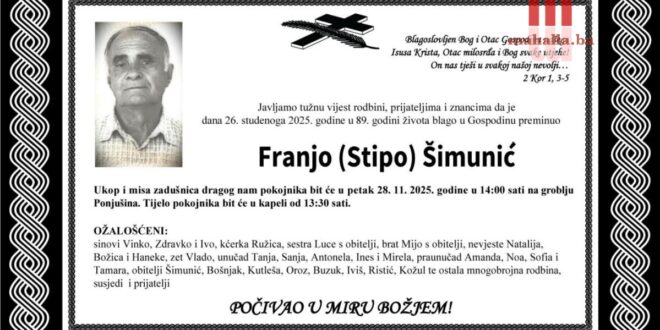 Ukop i misa zadušnica pokojnika bit će u petak, 28.11.2025. godine u 14:00 sati na groblju Ponjušina. Tijelo pokojnika bit će u kapeli od 13:30 sati.