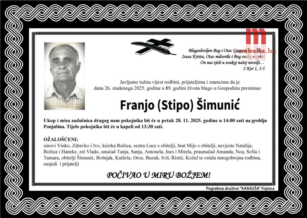 Preminuo je FRANJO (STIPO) ŠIMUNIĆ iz Fojnice u 89. godini života.