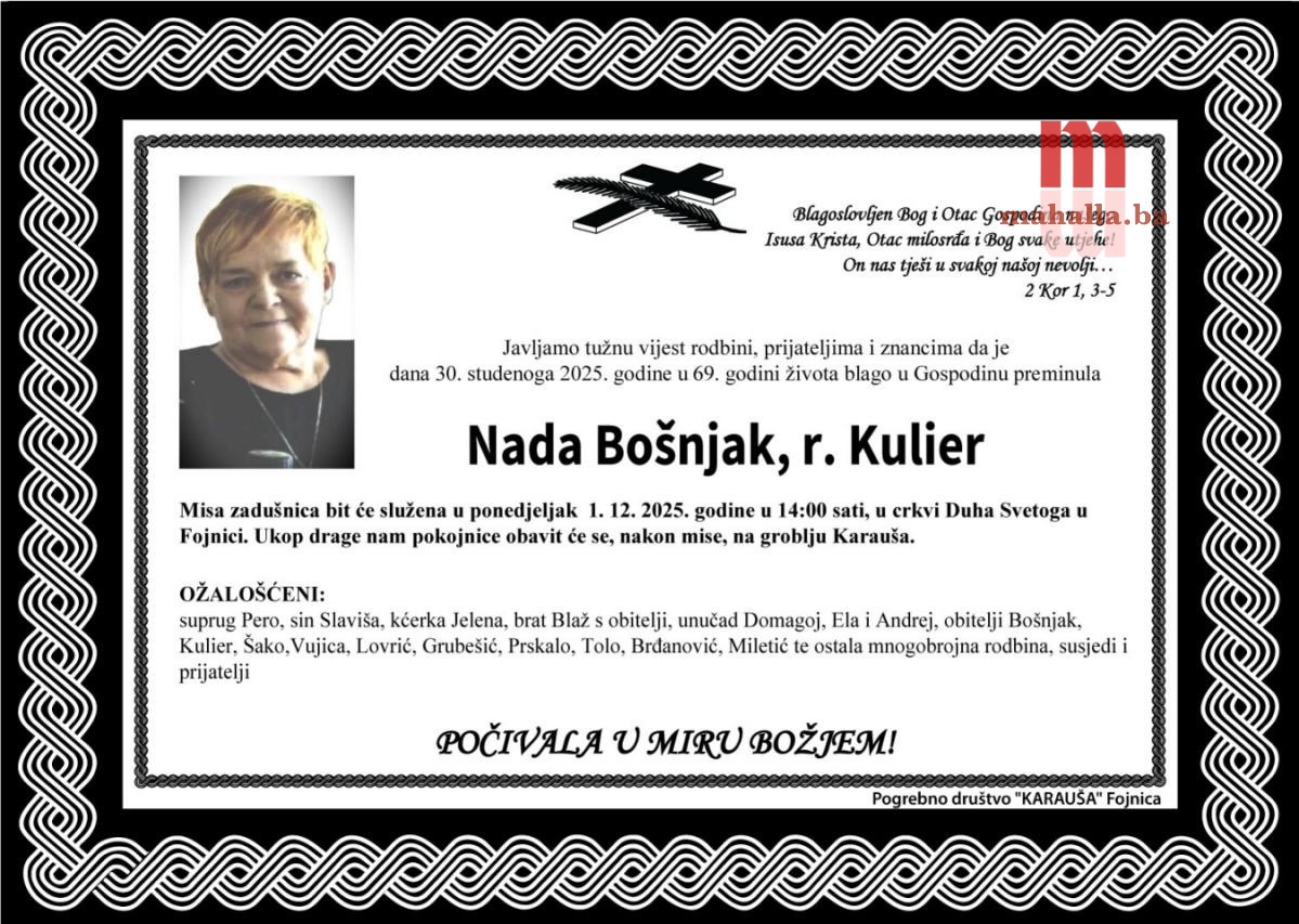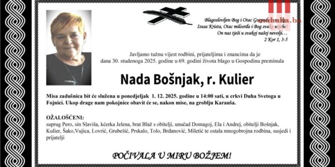 Preminula je NADA (PERICA) BOŠNJAK rođ. KULIER iz Fojnice u 69. godini života.