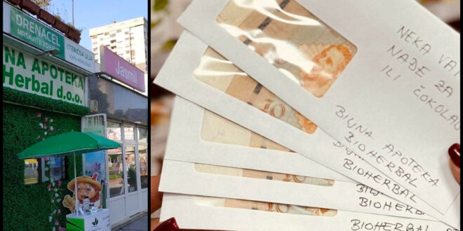 Bioherbal apoteka u ulici Zmaja od Bosne 50 uvela je praksu da svakog petka nekoliko penzionera slučajnim izborom dobije posebnu kovertu sa simboličnom novčanom pomoći.