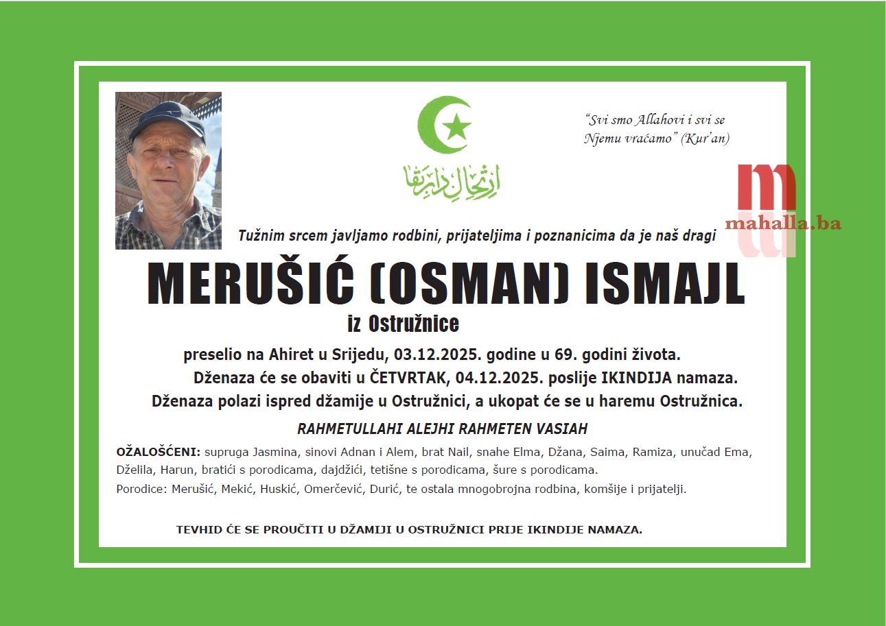 Na Bolji svijet je preselio MERUŠIĆ (OSMAN) ISMAJL iz Ostružnice.