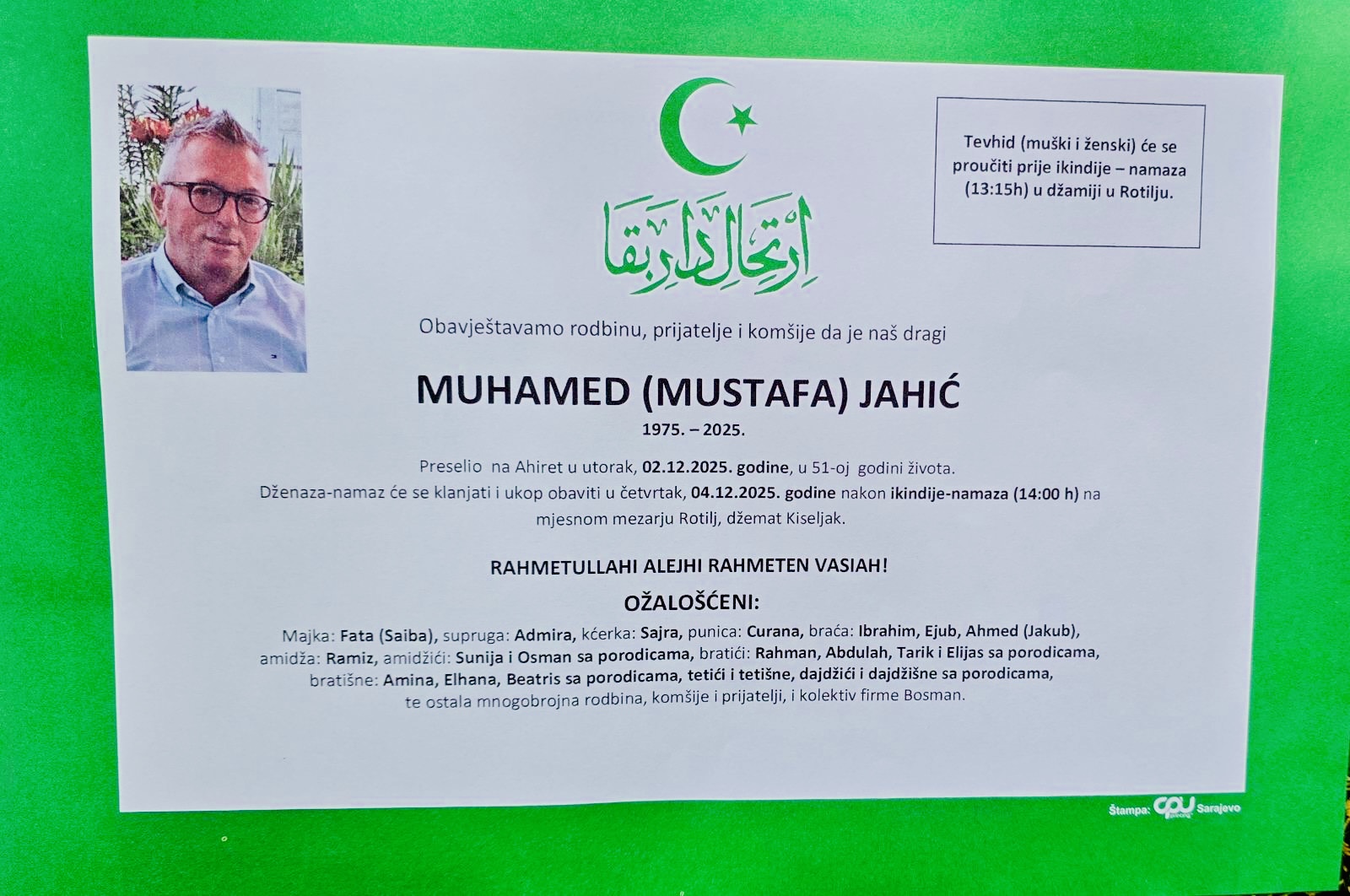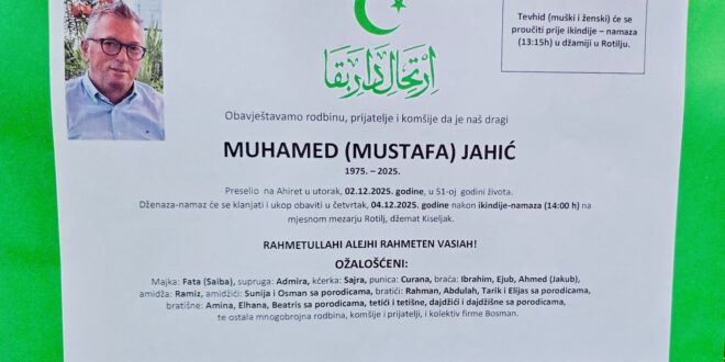 Dženaza-namaz će se klanjati i ukop obaviti u četvrtak, 04.12.2025. godine, nakon ikindije-namaza (14:00 h) na mjesnom mezarju Rotilj, džemat Kiseljak.