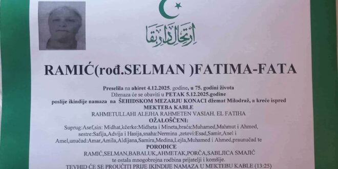 Dženaza-namaz će se klanjati i ukop obaviti u petak, 5.12.2025. godine, poslije ikindije-namaza na šehidskom mezarju Konaci, džemat Milodraž, a dženaza polazi ispred mekteba Kable.