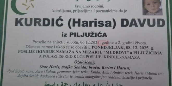 Dženaza-namaz i ukop će se obaviti u ponedjeljak, 8. decembra 2025. godine, poslije ikindije-namaza, na mezarju “Mudrovi” u Piljužićima.