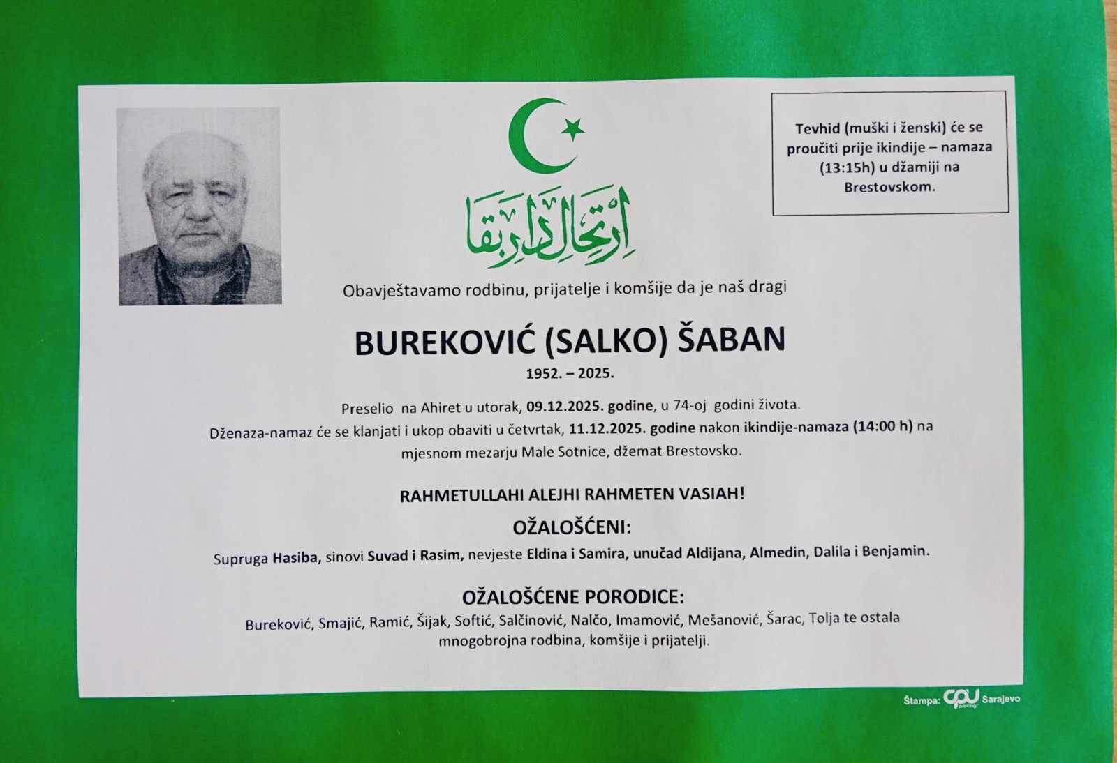 Dženaza-namaz će se klanjati i ukop obaviti u četvrtak, 11.12.2025. godine, nakon ikindije-namaza (14:00 h) na mjesnom mezarju Male Sotnice, džemat Brestovsko.