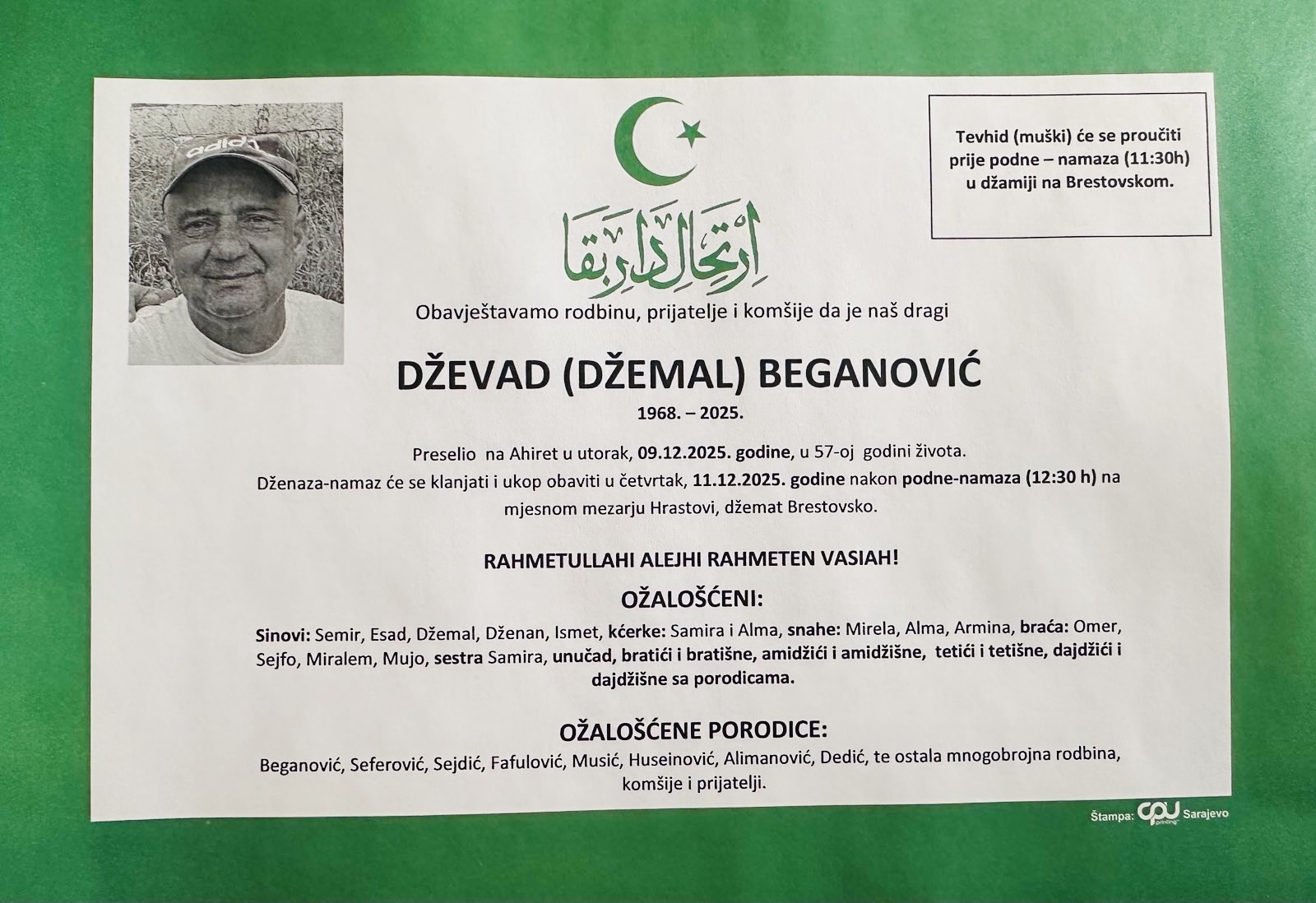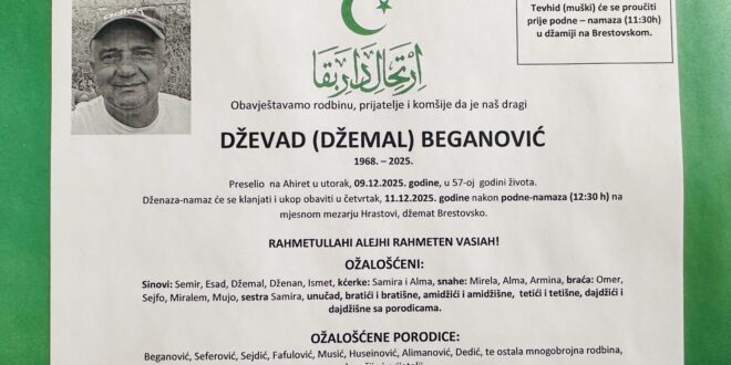 Dženaza-namaz će se klanjati i ukop obaviti u četvrtak, 11.12.2025. godine, nakon podne-namaza (12:30 h) na mjesnom mezarju Hrastovi, džemat Brestovsko.