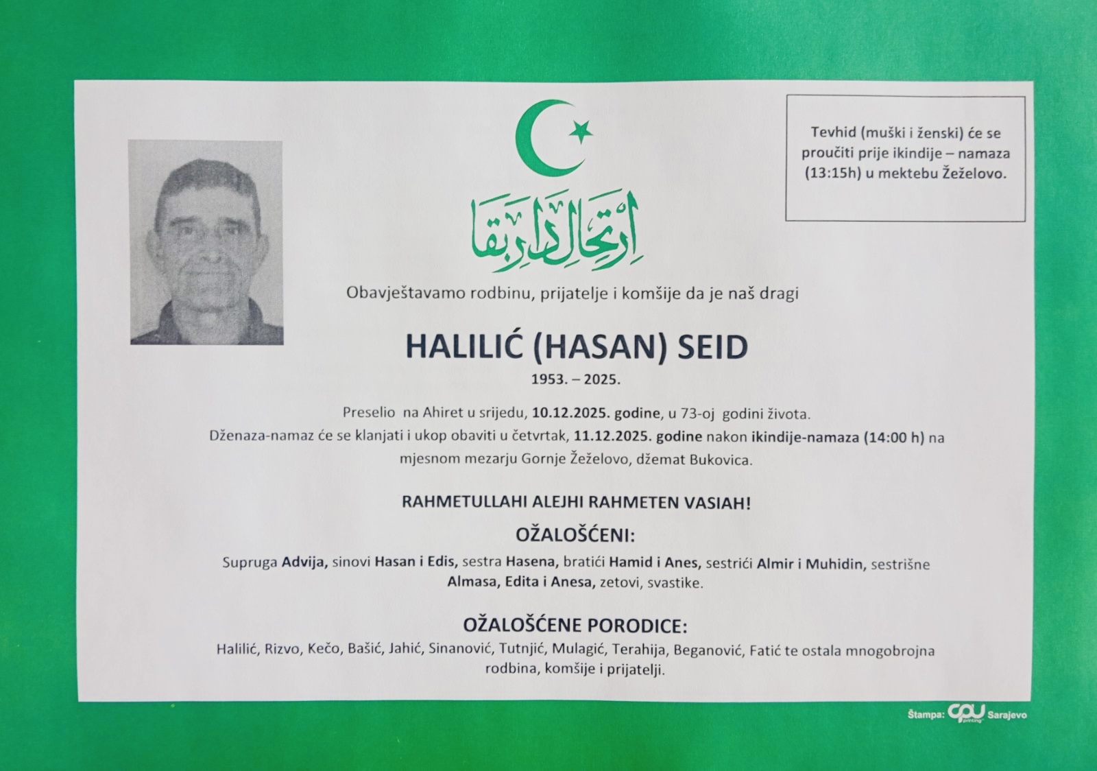 Dženaza-namaz će se klanjati i ukop obaviti u četvrtak, 11.12.2025. godine, nakon ikindije-namaza (14:00 h) na mjesnom mezarju Gornje Žeželovo, džemat Bukovica.