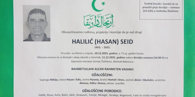 Dženaza-namaz će se klanjati i ukop obaviti u četvrtak, 11.12.2025. godine, nakon ikindije-namaza (14:00 h) na mjesnom mezarju Gornje Žeželovo, džemat Bukovica.