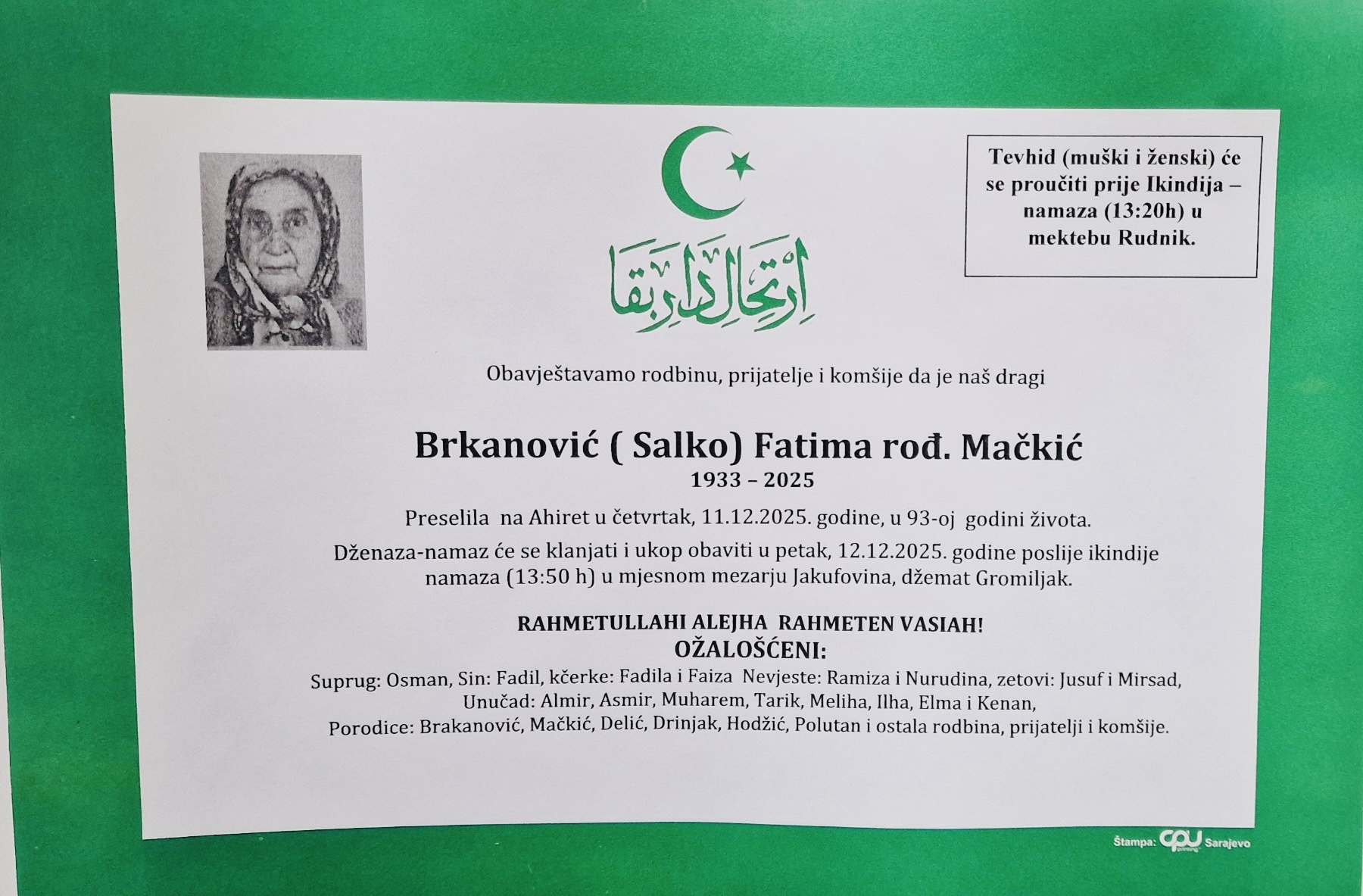 Dženaza-namaz će se klanjati i ukop obaviti u petak, 12.12.2025. godine, poslije ikindije-namaza (13:50 h), na mjesnom mezarju Jakufovina, džemat Gromiljak.